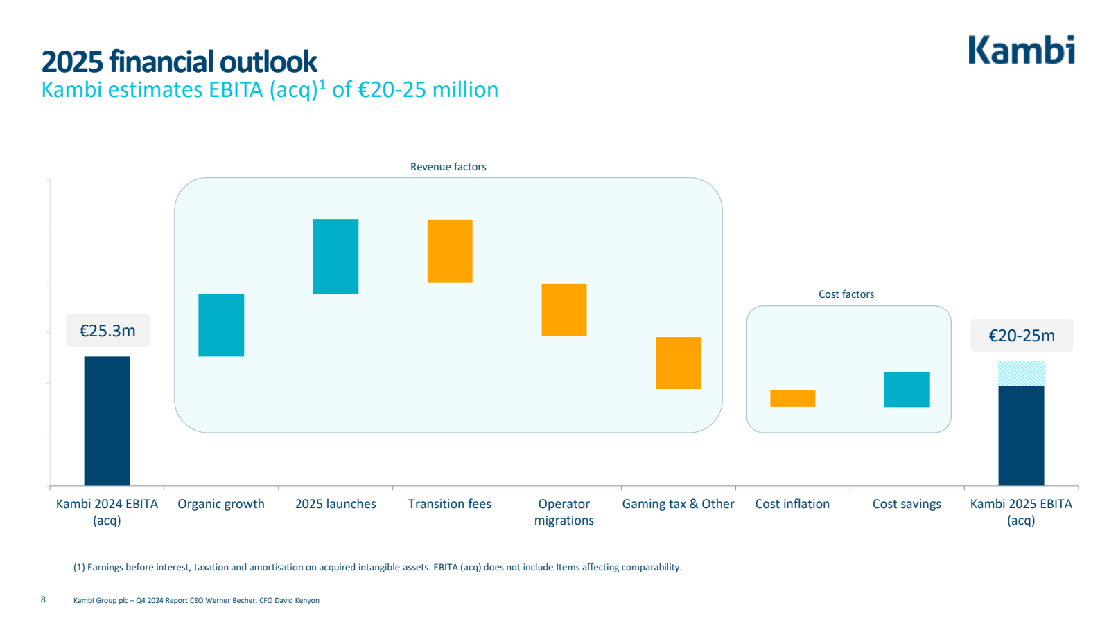 Full-year 2025 adjusted EBITA (acq) guidance revised down to around €17m due to macroeconomic pressures, FX headwinds, and delayed Ontario Lottery launch now expected in early 2026.