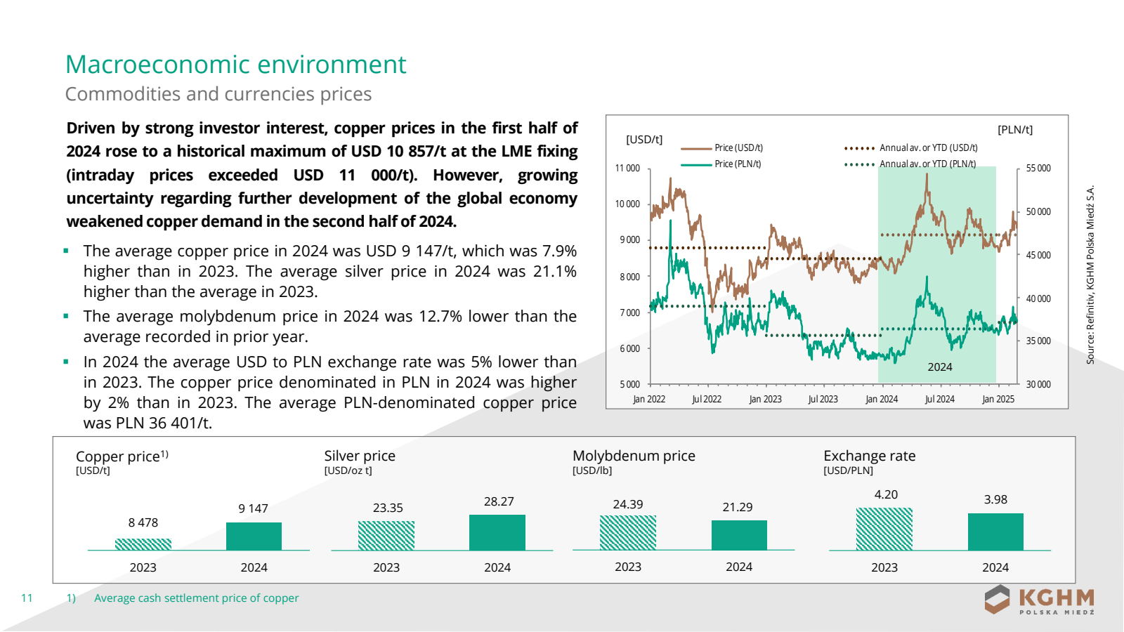 C1 unit cost for the Group fell 6% year-over-year, with significant reductions at KGHM INTERNATIONAL LTD. and Sierra Gorda S.C.M.; C1 cost for KGHM Polska Miedź S.A. rose 2%.